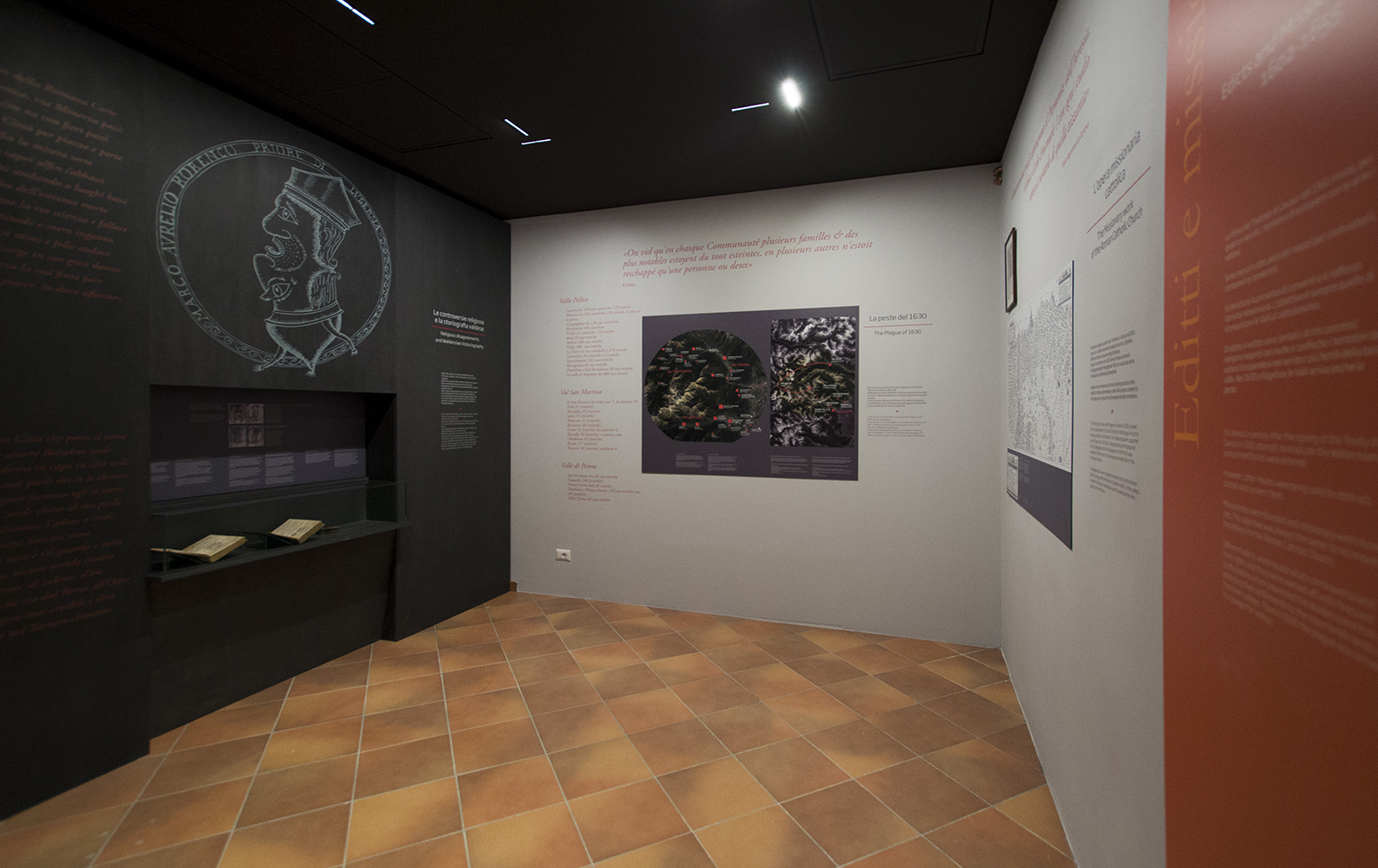 L’allestimento coniuga elementi di tradizione ed esposizione di oggetti storici con la presenza di tecnologie audio e video. Il percorso, dal Medioevo a oggi, è caratterizzato dalla realizzazione di arredi monocromatici (elementi “poveri” in fibro-cemento, pasta di legno, feltro), grafica “intrisa” nei muri e illuminazione variabile nascosta. La narrazione dei fatti storici più significativi è affidata invece alla comunicazione audio e a filmati evocativi di cui i progettisti hanno curato la regia e la resa grafica.