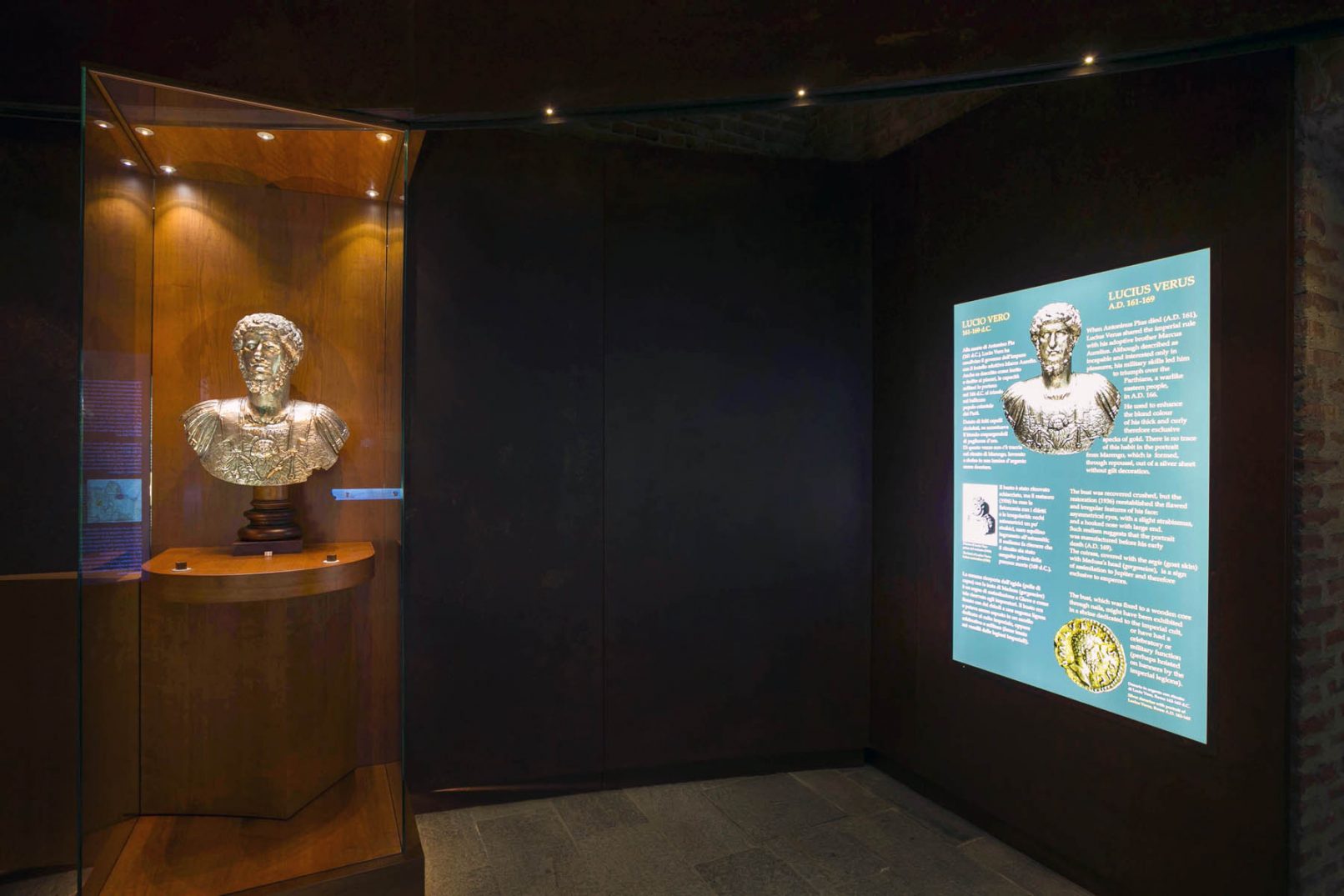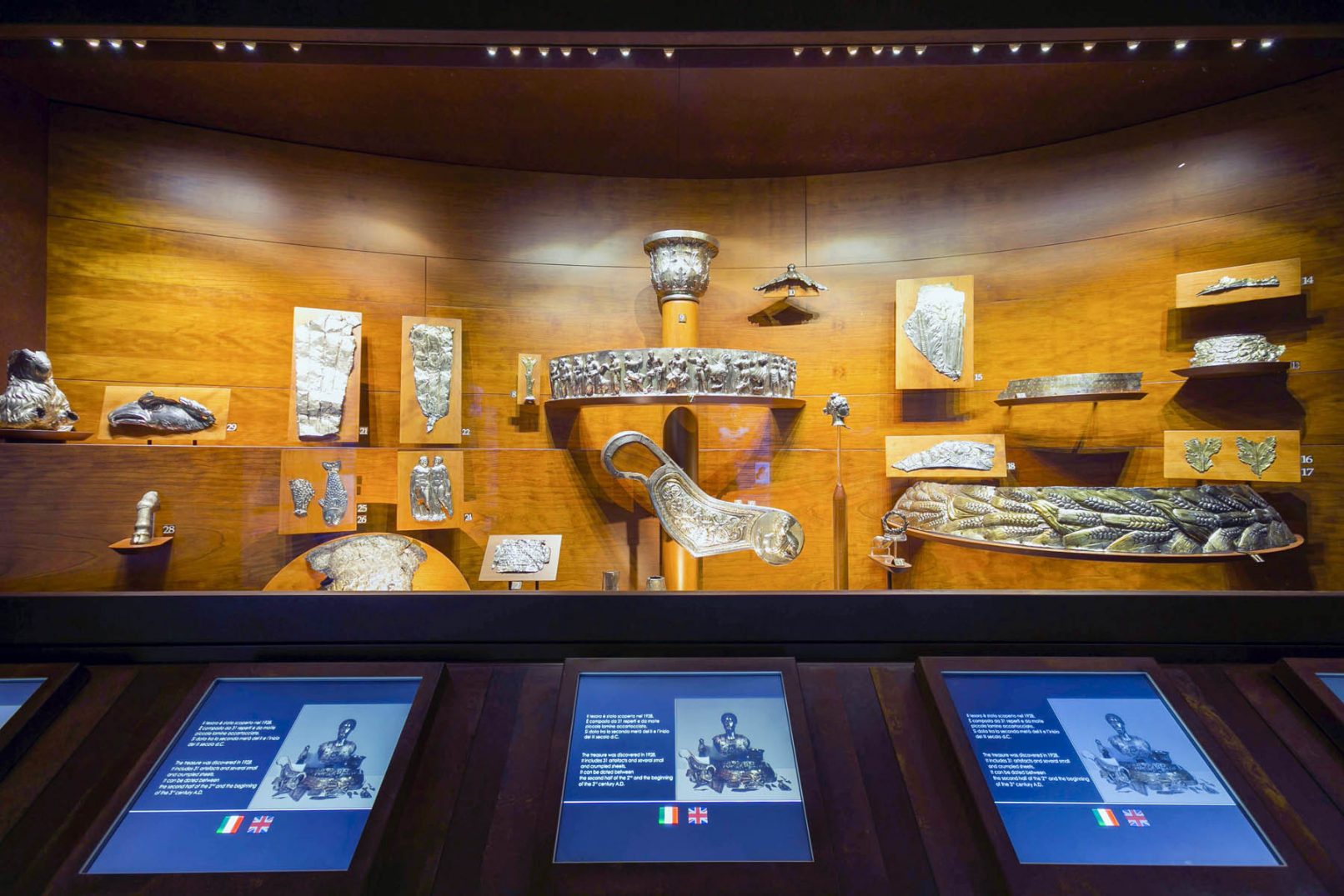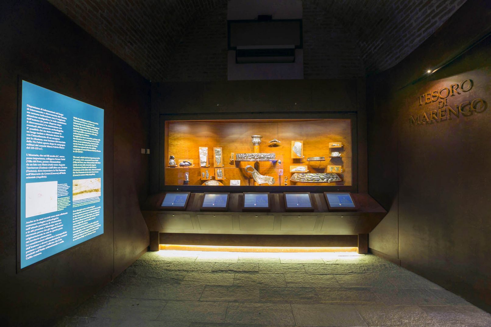 In corrispondenza della grande vetrina sono montati touch-screen per ampliare la comunicazione didascalica dei reperti esposti.